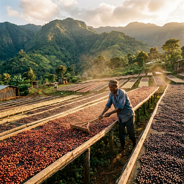 Phơi cà phê nguyên quả trên giàn phơi châu Phi (African beds).